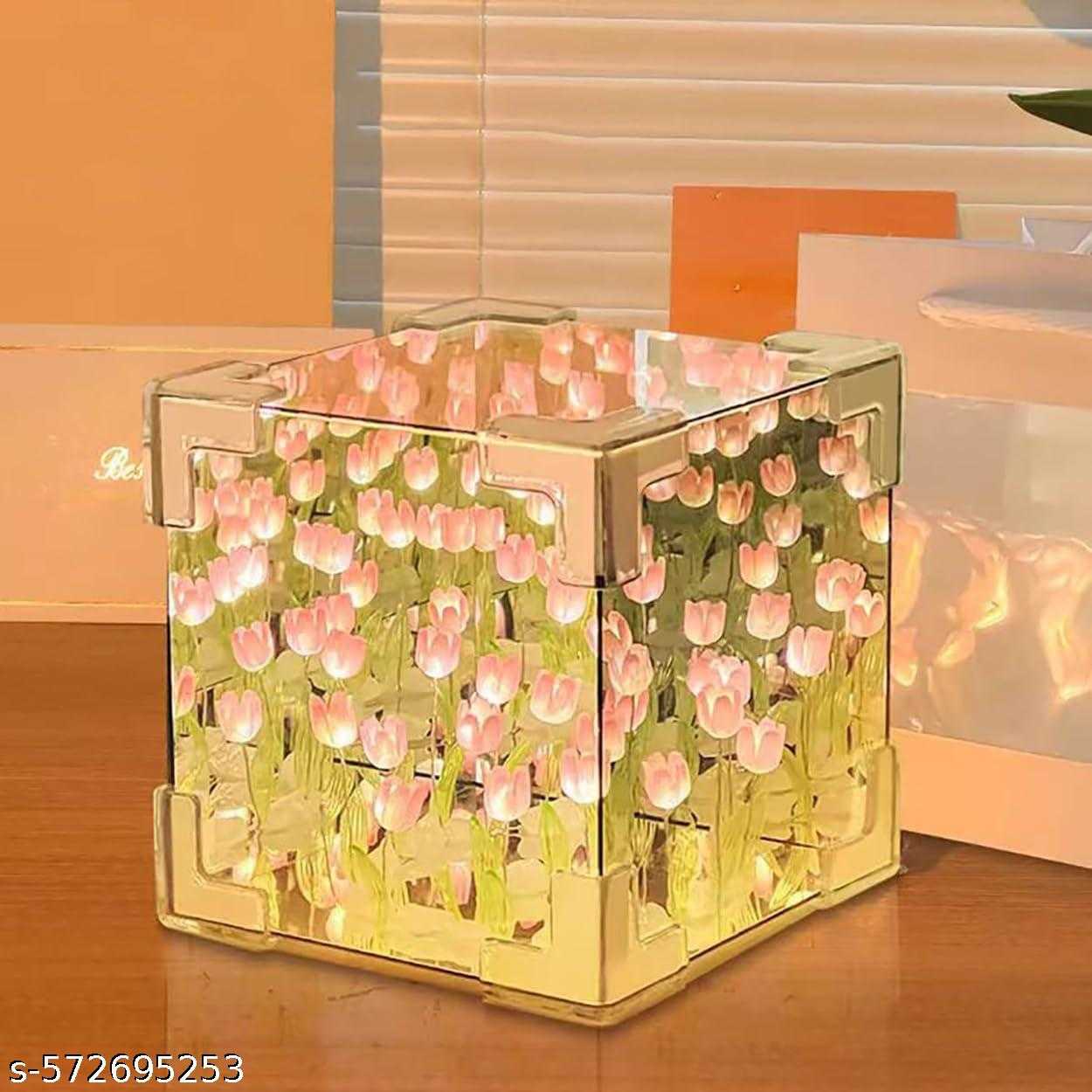 "Shop the Tulip Cube Mirror Lamp with 30 glowing LED tulips. Perfect decorative light for home décor, bedroom ambiance, or gifting. Stylish, elegant, and unique."
