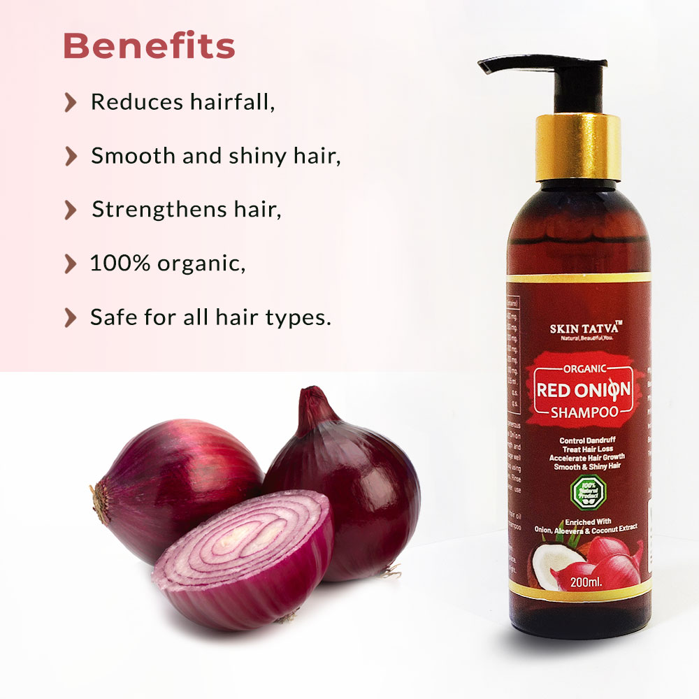 Onion shampoo by skin tatva helps you with hair growth, hair loss issues, scalp buildups, dull and weak hair. Onion shampoo is formulated with organic ingredients like red onion seed oil extract, black seed oil, sweet almond oil and pro-vitamin B5 that helps to strengthen hair follicles and clarify blocked roots. It is infused with red onion extract with strong antioxidant properties that help protect the scalp and hair, promotes blood circulation to the roots. Onion shampoo contains black seed oil that is rich in fatty acids that nourishes scalp and roots. Sweet almond oil keeps the scalp and hair conditioned. Onion shampoo for hair can be used to hydrate the roots and scalp and help make hair look healthy and lustrous. Suitable for all hair types, the onion shampoo is without sulfates, silicons, parabens and color.