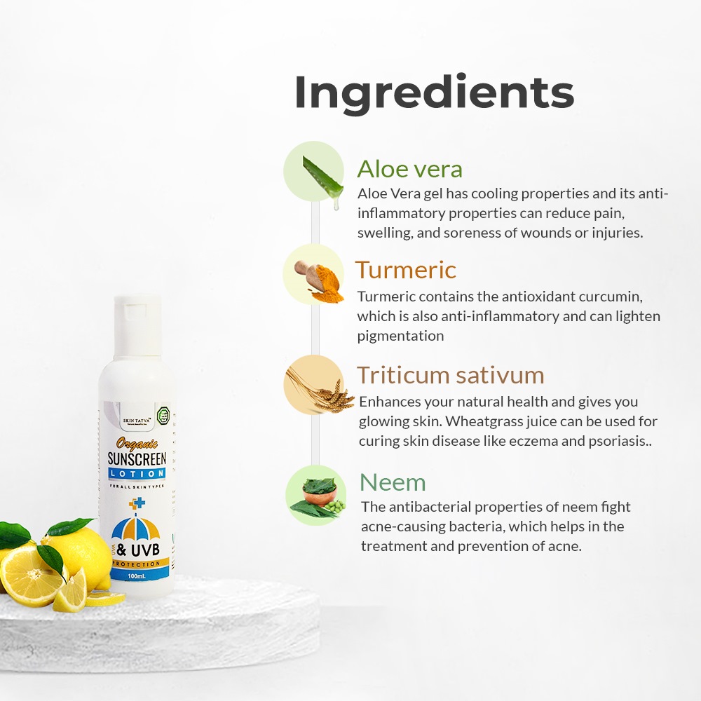 Skin tatva organic sunscreen lotion is free from harmful parabens. It is enriched with the goodness of: Purified Water: Makes lotion light and quick-absorbing aloevera : absorbs excess oil, thus reducing occurrence of pimples and blackheads, giving a clear matte look Lemon Extract: Lemon extract is rich in Vitamin C which helps fade dark spots and tanning.